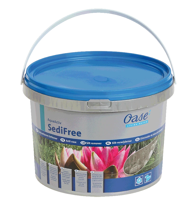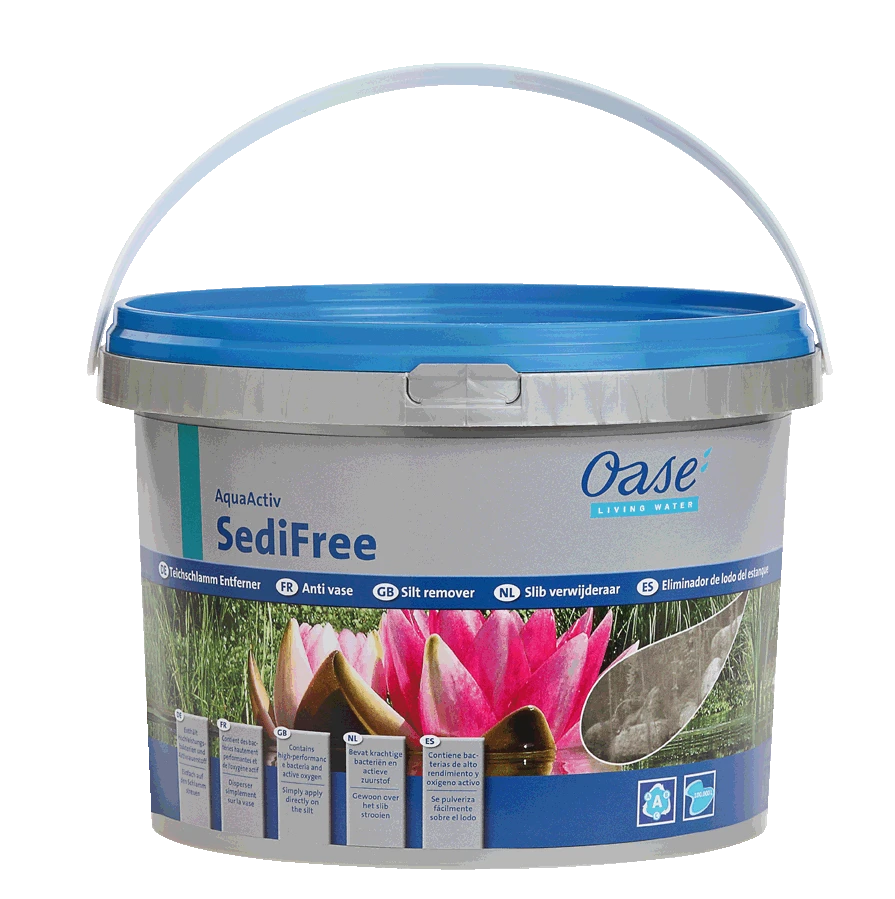 Durch abgestorbene Algen, Laub und Pflanzenreste bilden sich in schwach durchströmten Teichzonen Mulm und Schlammschichten. Der wirkungsvolle eichschlammentferner Oase SediFree wandelt diesen organischen Schlamm mit Hilfe von speziellen Hochleistungsbakterien um. Dabei sinkt das Granulat mit Aktivsauerstoff in den Schlamm ein und oxidiert diesen. Danach erfolgt der schnelle Abbau. Ihr Gartenteich kann so auch ohne Wassererneuerung oder Ausbaggern wieder schlammfrei werden. Gleichzeitig beugt Oase SediFree einer erneuten Verschlammung, Dauertrübung und Algenpolstern vor.
