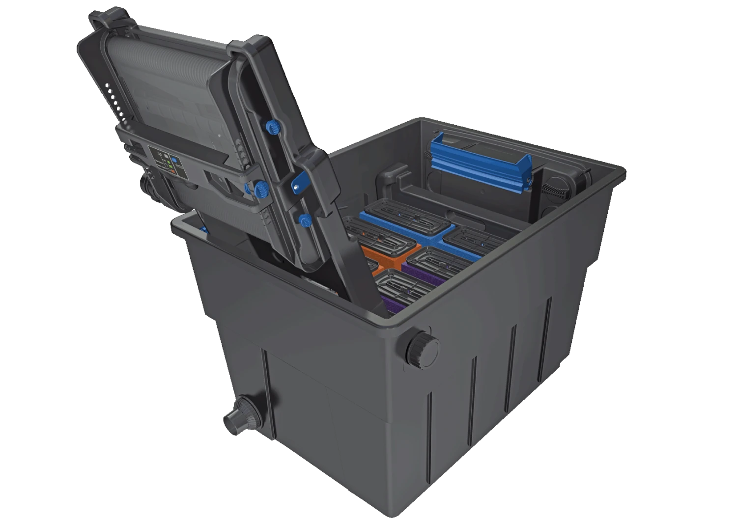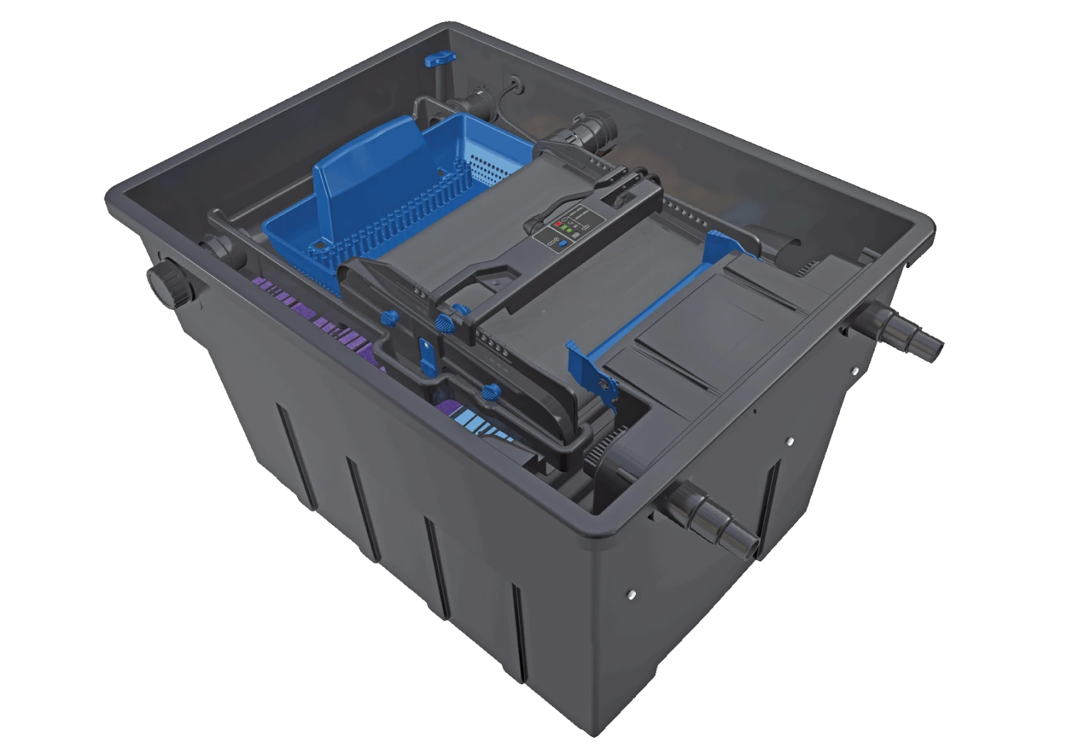 Der hocheffektive Durchlauffilter Oase BioTec ScreenMatic2 60000 ist dank Grobschmutzabscheidung vor Eintritt in den FIlter sehr wartungsarm. Die justierbare Reinigungsautomatik steuert den Bandlauf anhand des Verschmutzungsgrades und bietet somit hohen Komfort dank automatisch angetriebener Selbstreinigung des Filterbandes inklusive LED-Funktionskontrolle. Auch die Reinigung der Filterschwämme direkt im Filter ist durch einen Bodenablauf mit Schieber zur Entfernung von Schmutz aus dem Filtersystem sehr bequem. Die verschiedenen Filtermedien sorgen für eine ideale Entfaltung der Filterbiologie. Durch das robuste und seitenverstärkte Bandmaterial, sowie den doppelt abgedichteten Motor hat der Hochleistungsfilter Oase BioTec ScreenMatic2 60000 eine besonders lange Lebensdauer. Für eine gleichmäßige Verteilung des Wassers auf dem Filterband sorgt der Wasserverteiler ohne Verstopfungsgefahr. Ein manueller Bandlauf mittels Taster ist ebenfalls möglich. Eine Bürste zur gelegentlichen Reinigung des Filterbandes Bestandteil des Oase BioTec ScreenMatic2 60000. Für eine einfache Handhabung sorgt auch der Schmutzkorb mit großem Volumen. Ein exzellentes Abscheidungsergebnis entsteht durch die fuktional optimierte Abscheidelippe. Sturmsichere Befestigungsclips am Deckel garantieren festen Halt.