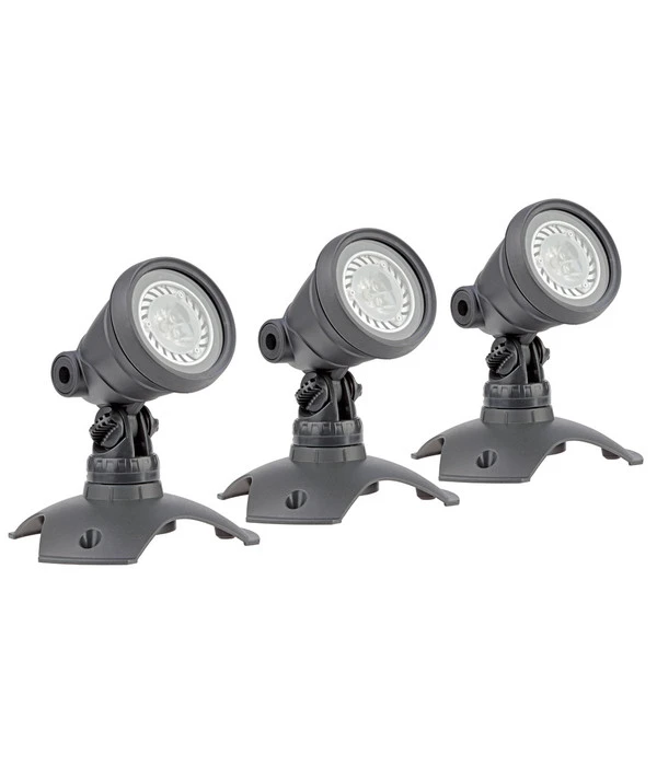 Die Power-LED-Scheinwerfer aus diesem Set überzeugen mit einer Leuchtkraft von 110 Lumen, durch die eine besonders helle Ausleuchtung mit angenehmem, weißem Licht erzielt werden kann. Trotz dieser hohen Leuchtkraft sind die Scheinwerfer bei einer Leistungsaufnahme von 3 Watt äußerst energieeffizient und ermöglichen Ihnen somit, eine hervorragende Beleuchtung zu genießen und gleichzeitig den Stromverbrauch niedrig zu halten. Der Halbstreuwinkel der Powerscheinwerfer von 30° sorgt für eine breite Ausleuchtung Ihrer Pflanzen und anderer Gartenhighlights, außerdem besitzen die drei Scheinwerfer dieses Sets einen verstellbaren Kopf, mit dessen Hilfe eine flexible Ausrichtung des Strahlwinkels möglich wird. Die Oase LED-Beleuchtung LunAqua 3 LED Set 3 schafft mit ihrer Flexibilität und ihren kräftigen LEDs eine perfekte Beleuchtung eines jeden Gartens – und das bei einem außergewöhnlich niedrigem Energieverbrauch.