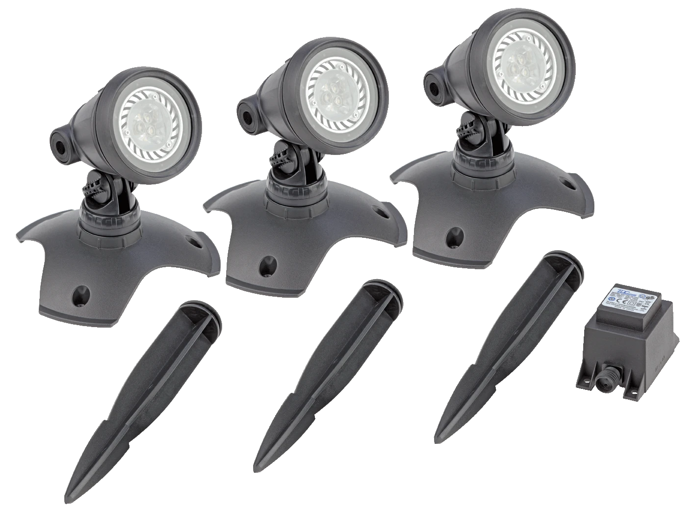 Im Lieferumfang sind 3 Scheinwerfer, 12 V Trafo, Gummischlauchleitung sowie 3 ErdspieĂe enthalten.
