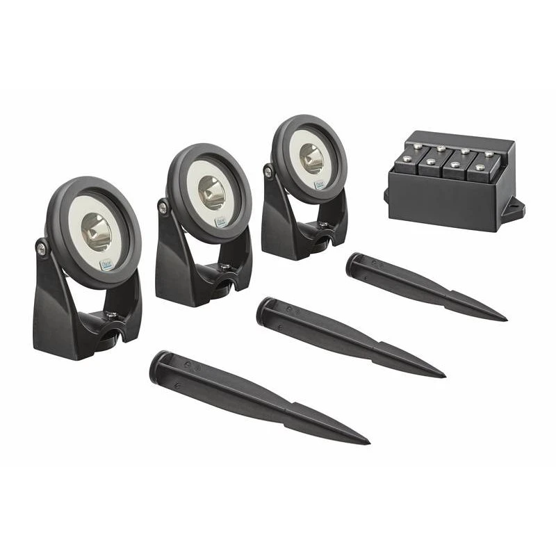 - Im Lieferumfang enthalten: 1 bzw. 3 Leuchten mit je 5 m Kabel, LED-Treiber mit Anschlussmöglichkeit für 4 Leuchten sowie 1 bzw. 3 Erdspieße