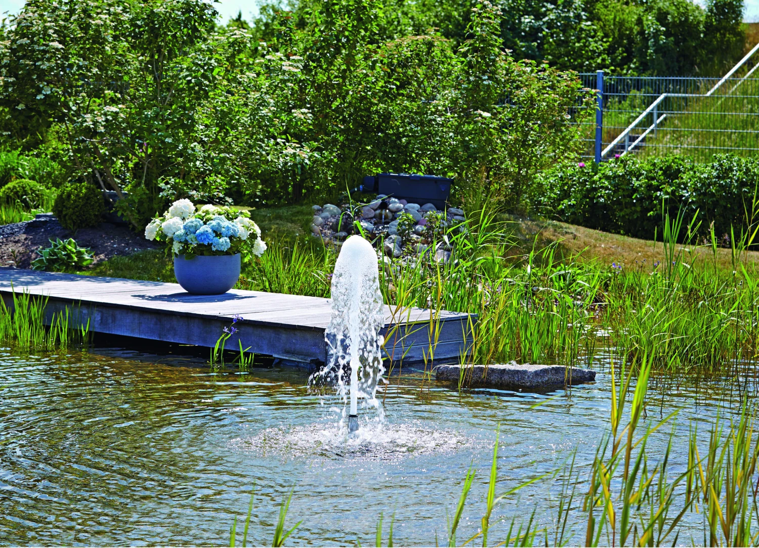 Der FontÀnenaufsatz aus langlebigem Edelstahl kann wasserstandsunabhÀngig eingesetzt werden. Er wird oberhalb des Wasserspiegels installiert.